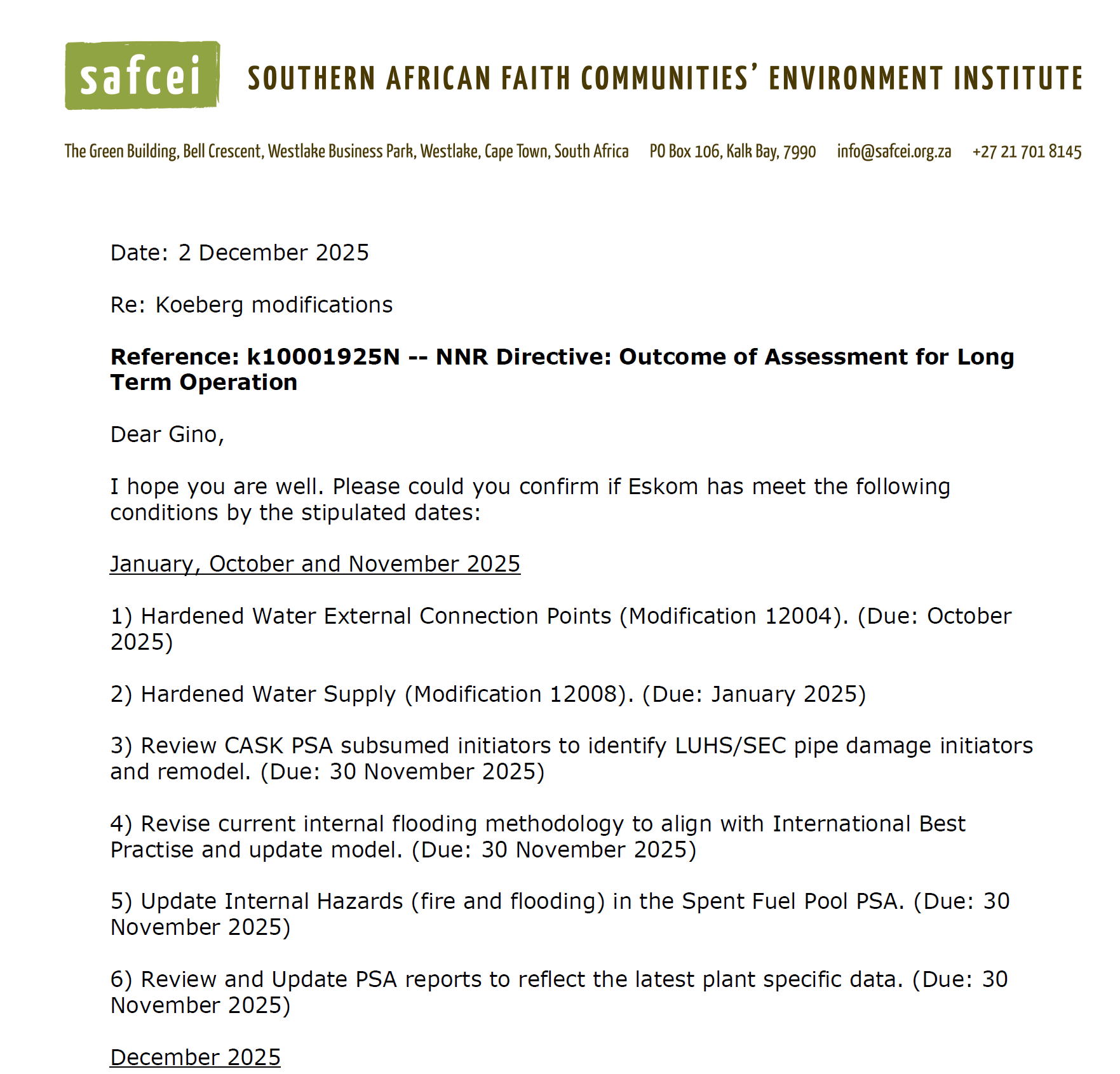 Click here to read the NNR's response to SAFCEI's letter to the NNR Directive: Outcome of Assessment for Long Term Operation...